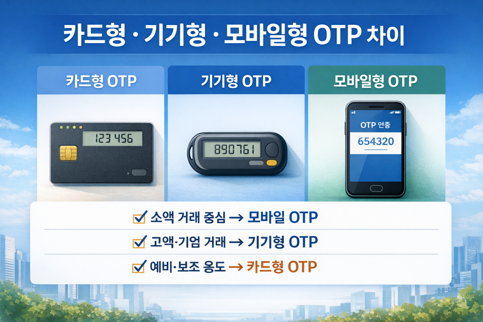 - 카드형·기기형·모바일 OTP는 보안 구조와 사용 편의성에 차이가 있음