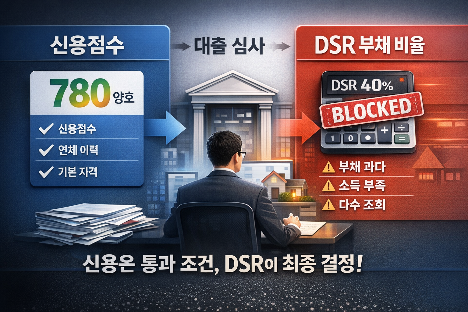 신용점수가 괜찮아도 DSR, 부채 구조, 최근 대출 조회 이력에 따라 대출이 거절될 수 있습니다. 점수보다 현재 금융 구조가 심사 결과에 더 큰 영향을 줍니다.