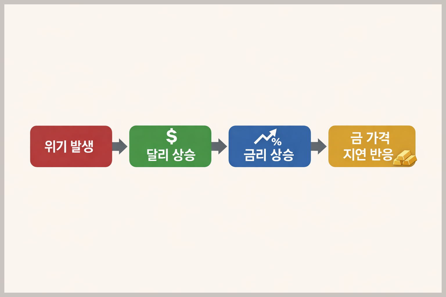 이 흐름이 반복되면서 한 가지 의문은 “왜 위기 상황인데도 금이 바로 오르지 않을까?”입니다.